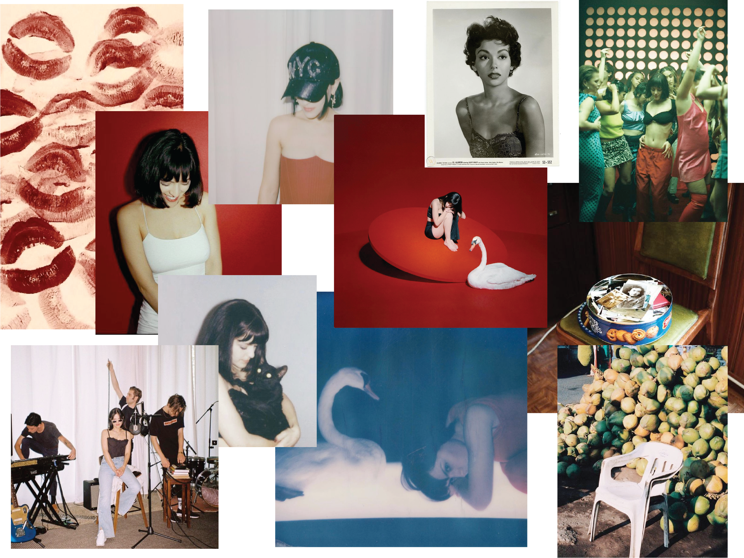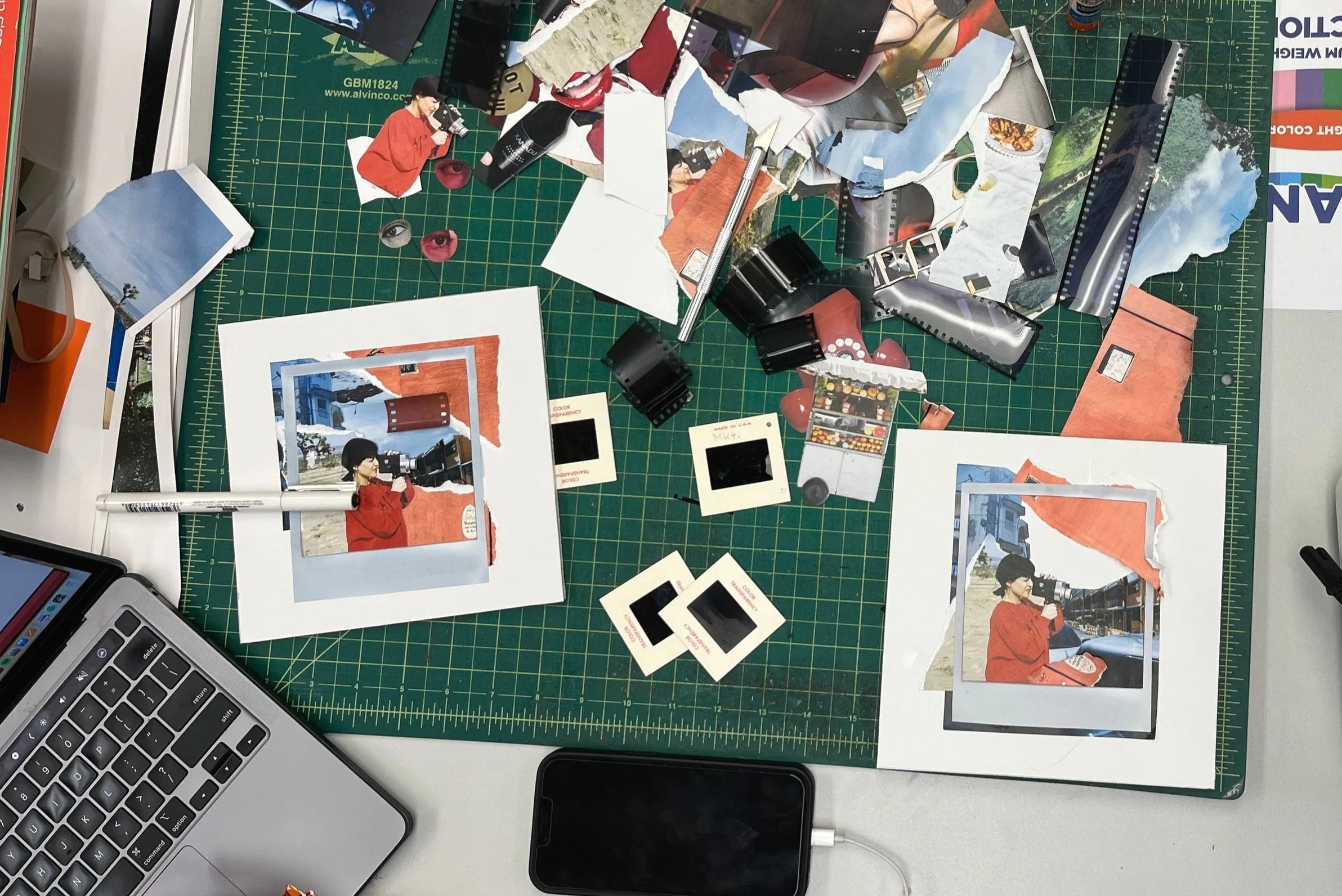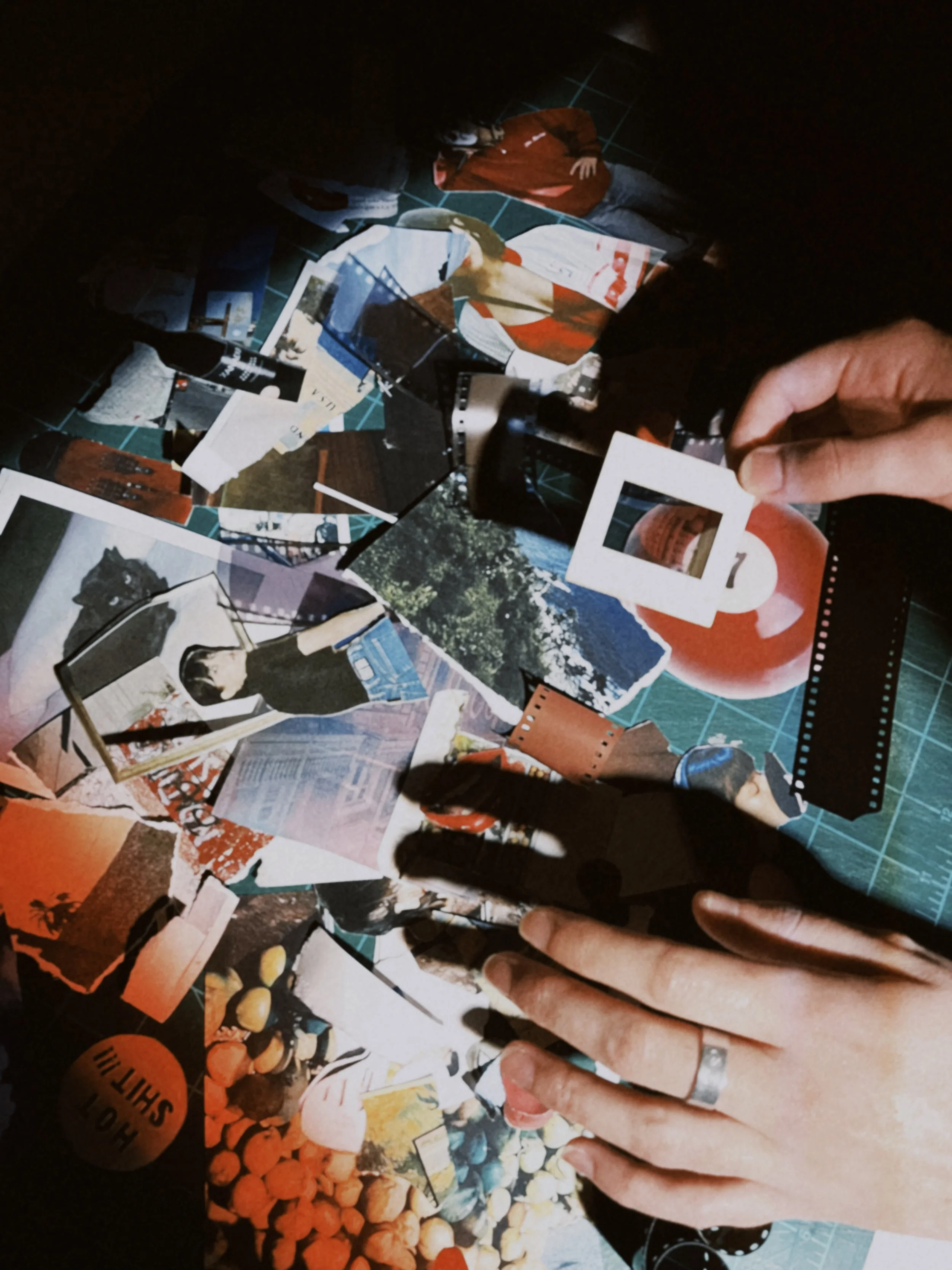 I created a multimedia collage with elements of film photography, photos of the band, and their inspirations. I made all the additional elements with different experimental methods of text and pattern-making, including kissing all over a piece of paper with lipstick. The type and composition of the album reference vintage photo slides while incorporating elements of the band’s branding. This process consisted of lots of scanning, cutting, gluing, printing, and ripping and was done primarily physically, which was my favorite part.